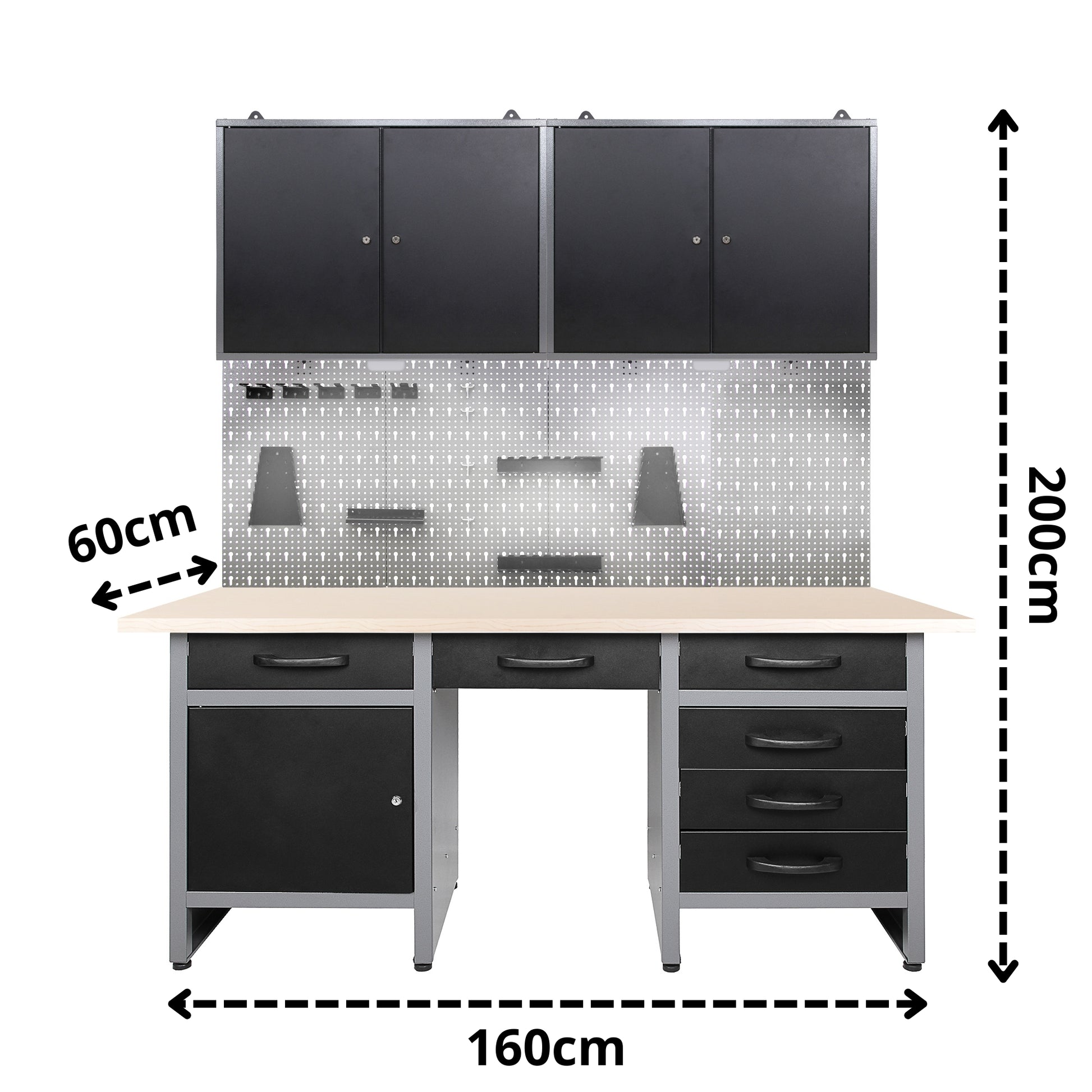 Brico-Garage 2 Pack – Banco da lavoro con nicchia centrale, pannelli forati e doppi armadietti superiori con serratura per officina e garage