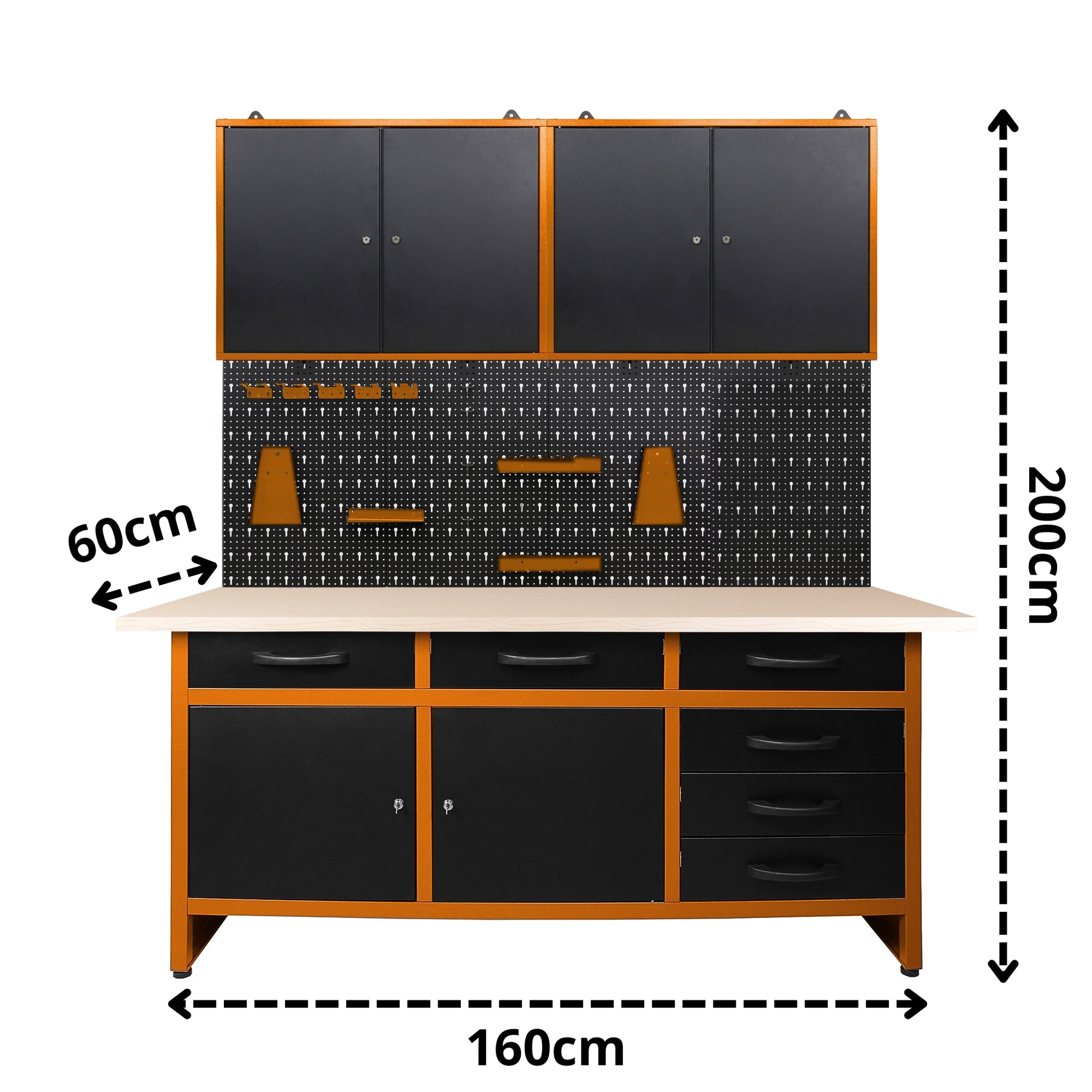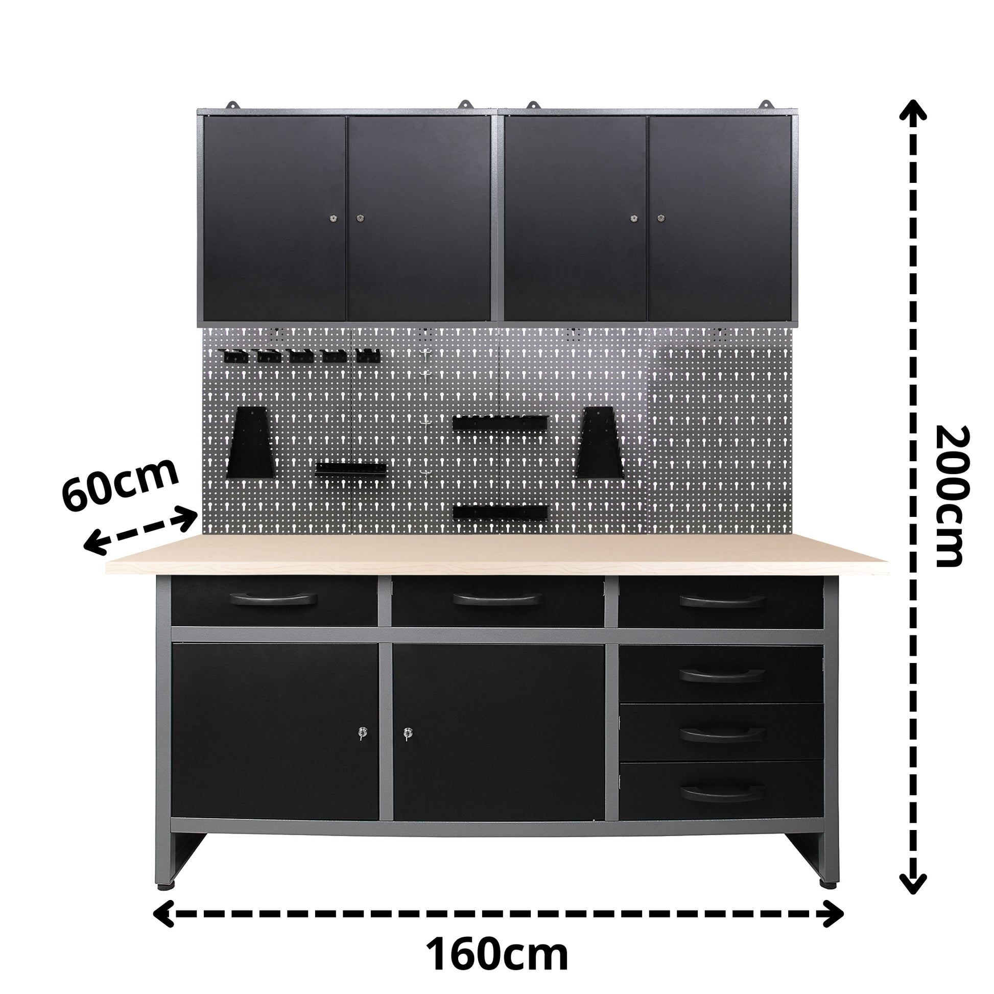 Kit fai da te 2 – Banco da lavoro con cassetti e armadietti, pannello forato e due armadietti a muro in metallo con serratura per officine e garage