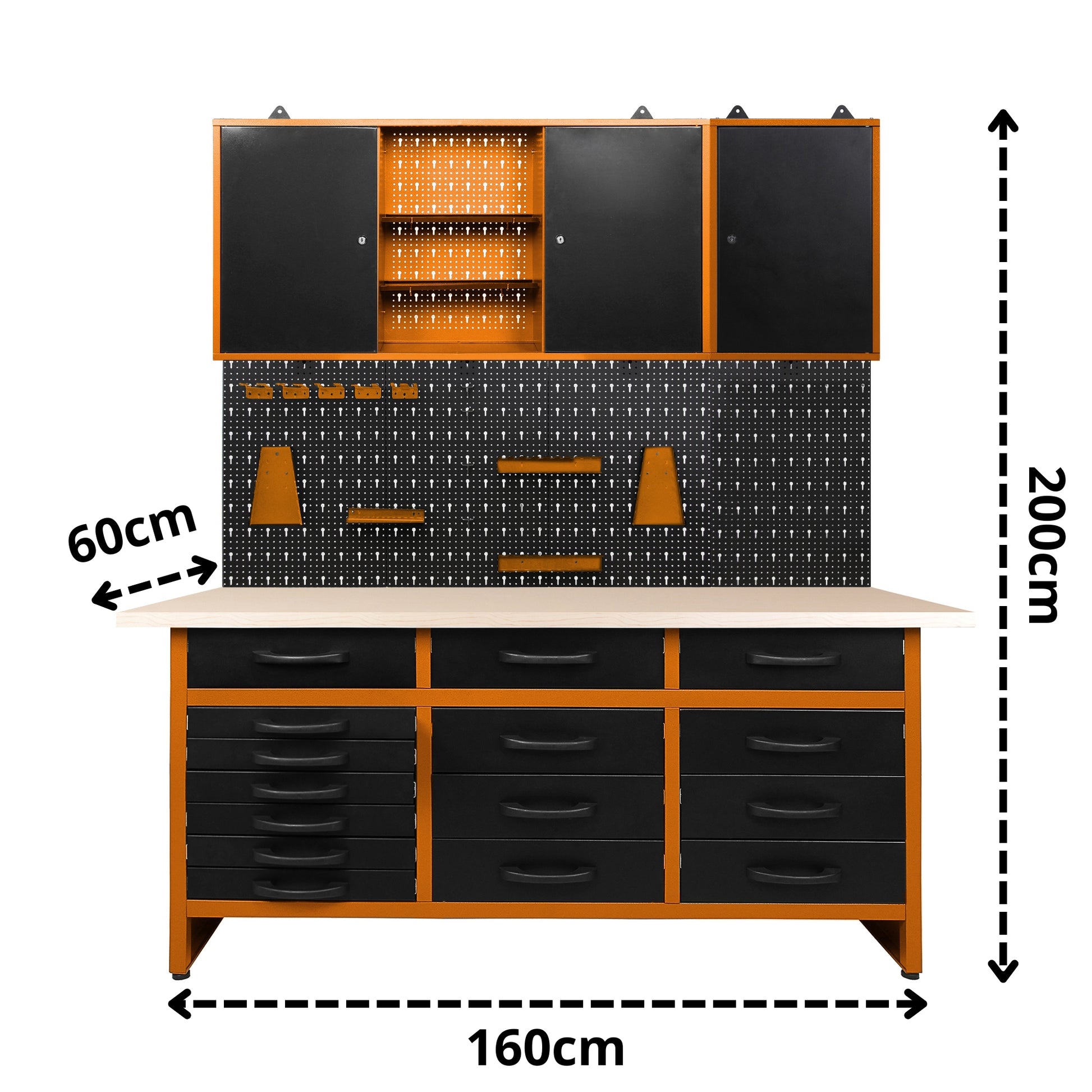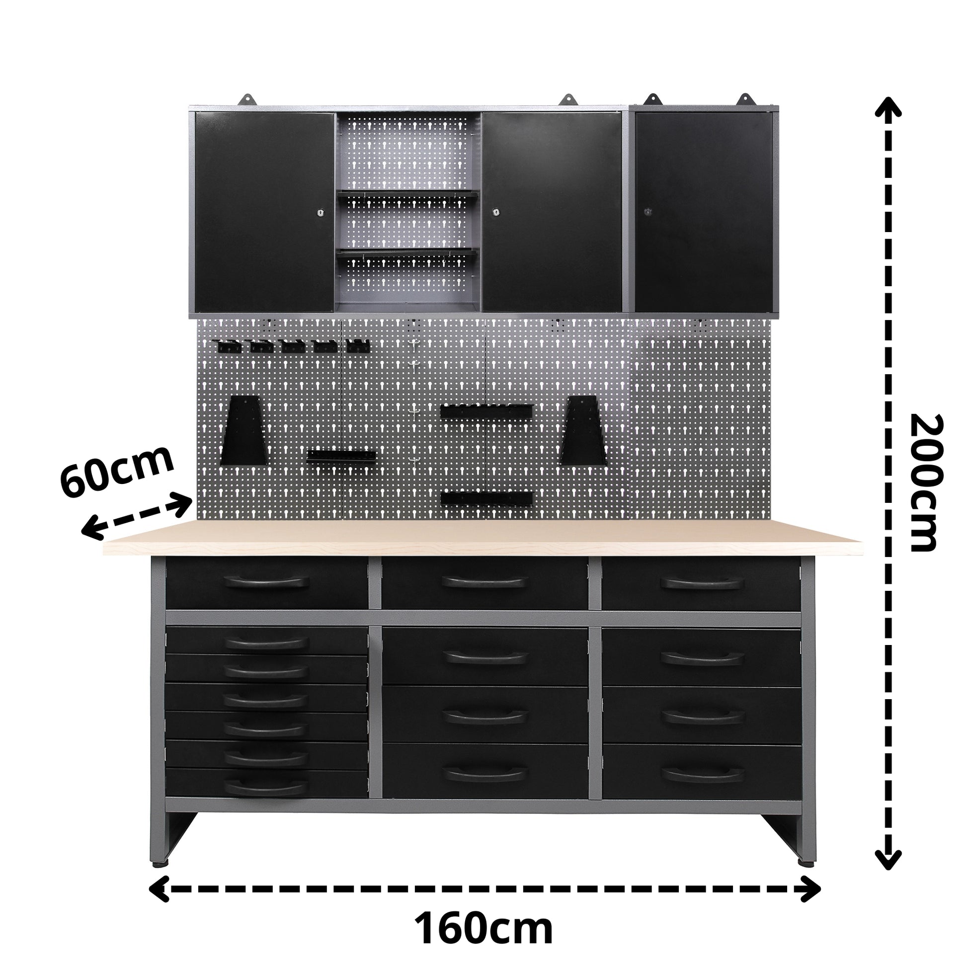 Pacchetto di stoccaggio professionale 1 – Banco da lavoro con 15 cassetti, armadi a muro e pannello forato per i professionisti dello stoccaggio in officina o in garage